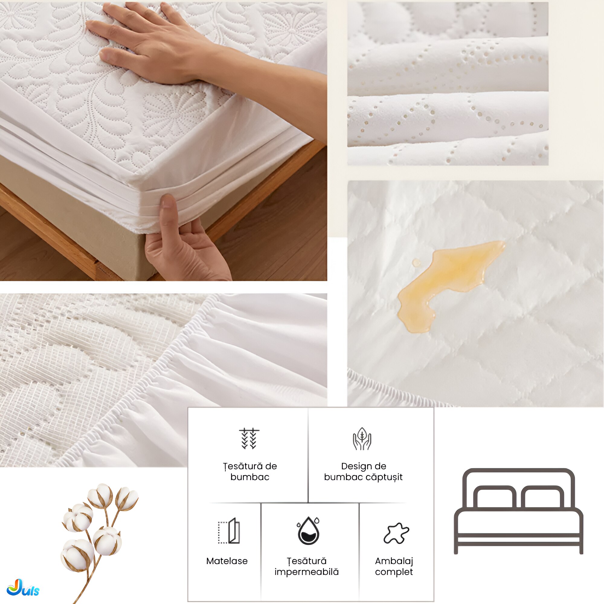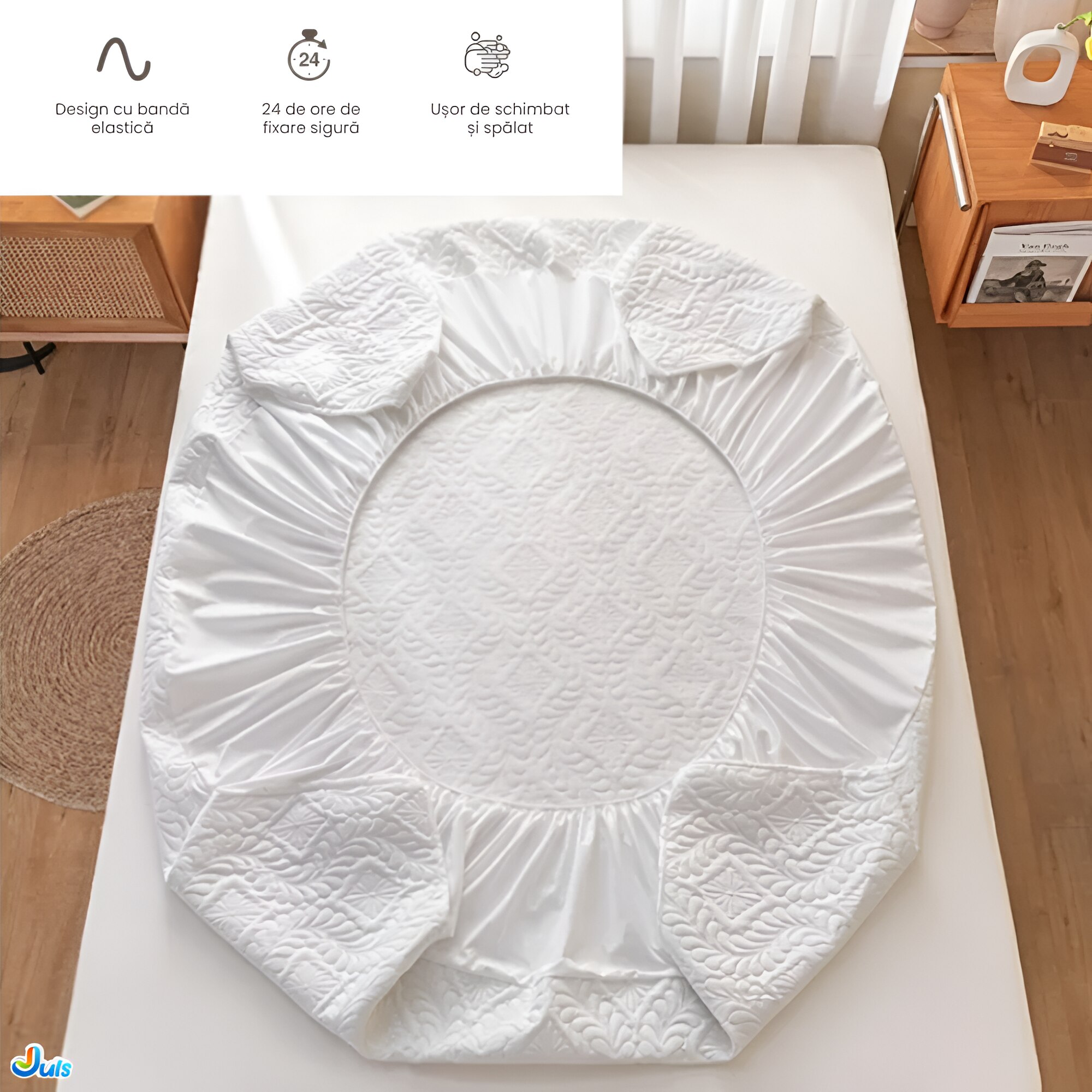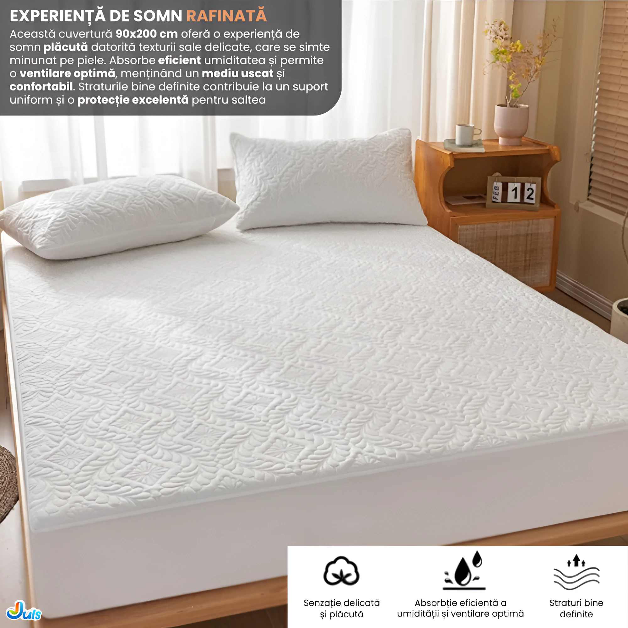 Cuvertura de pat matlasata impermeabila de 90 x 200 cm este solutia ideala pentru protejarea si imbunatatirea confortului saltelei tale. Fabricata de Juls, acest produs combina functionalitatea excelenta cu un design practic pentru a asigura un somn odihnitor si o protectie eficienta.
