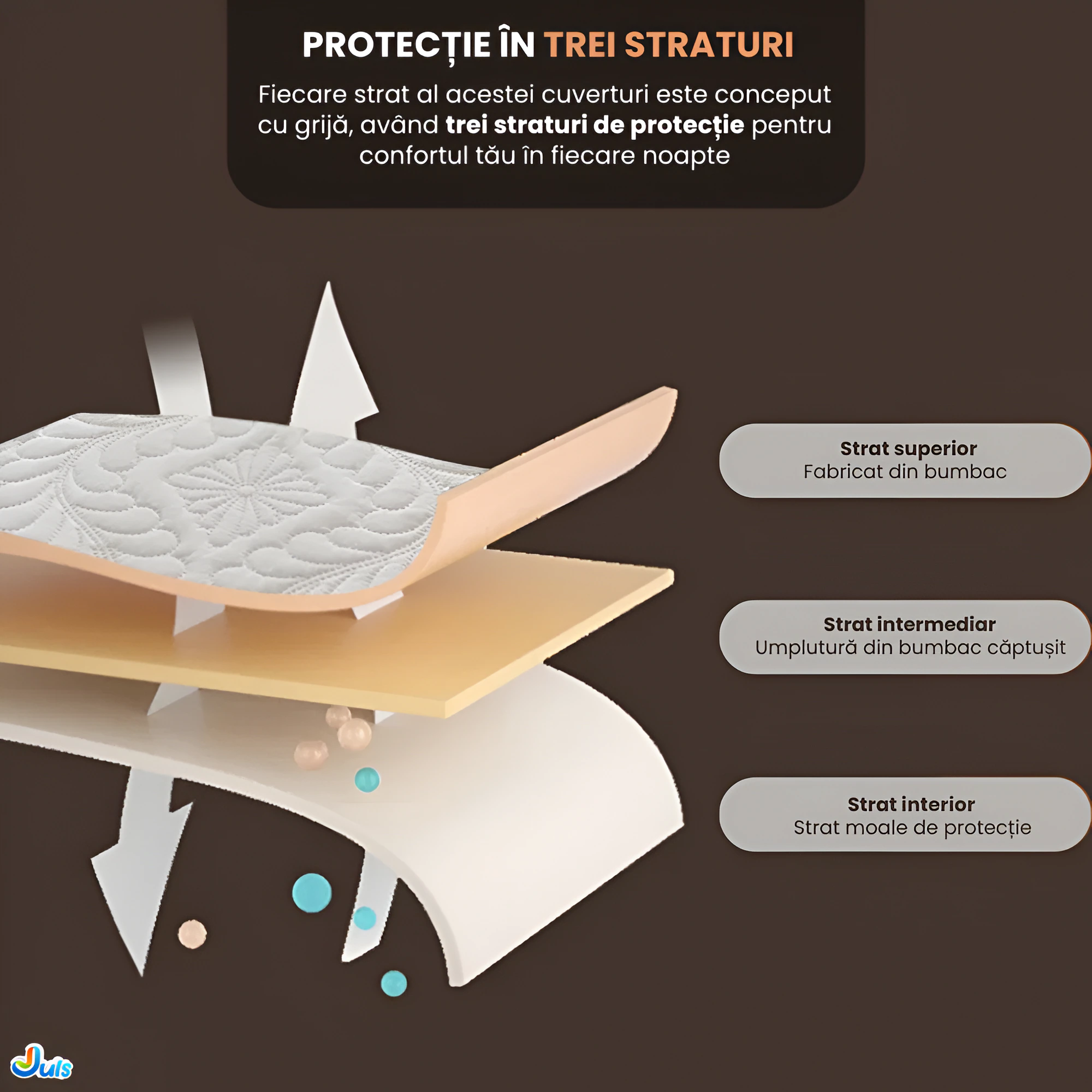 - Strat Intermediar: Umplutura din Bumbac Captusit pentru absorbtia eficienta a umiditatii si mentinerea unei temperaturi constante.