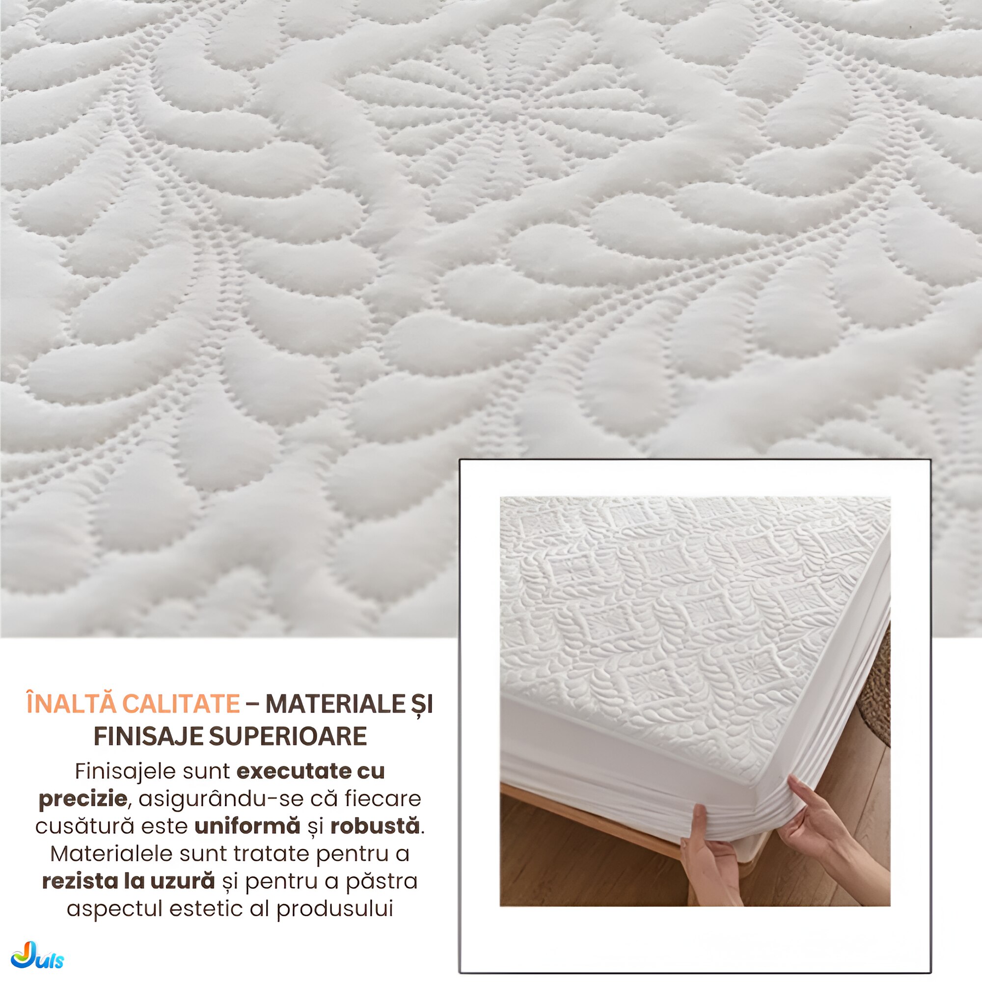 - Strat Inferior: Strat Moale de Protectie care previne deteriorarea saltelei prin protejarea impotriva lichidelor si petelor.