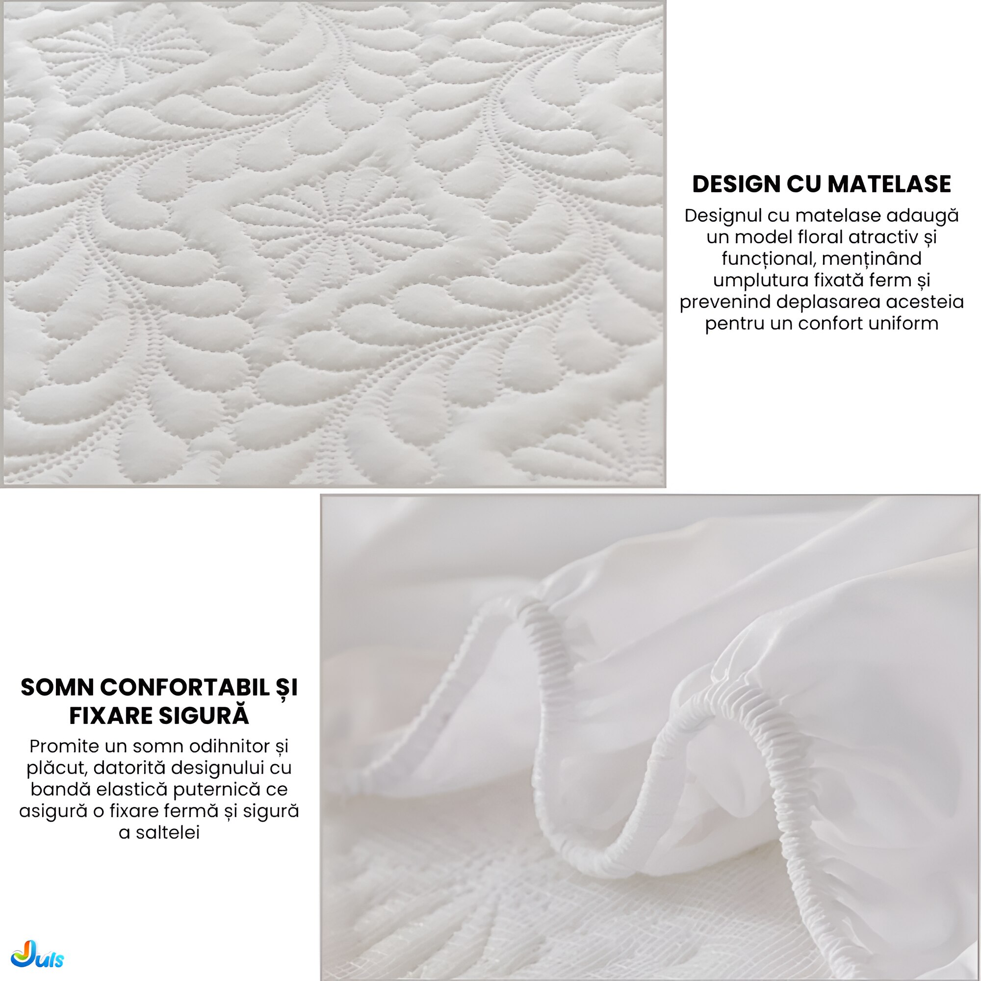 Cuvertura matlasata cu model floral adauga un aspect placut si ajuta la fixarea umpluturii, prevenind deplasarea acesteia. Banda elastica asigura o prindere sigura a saltelei, garantand un somn confortabil si stabil.