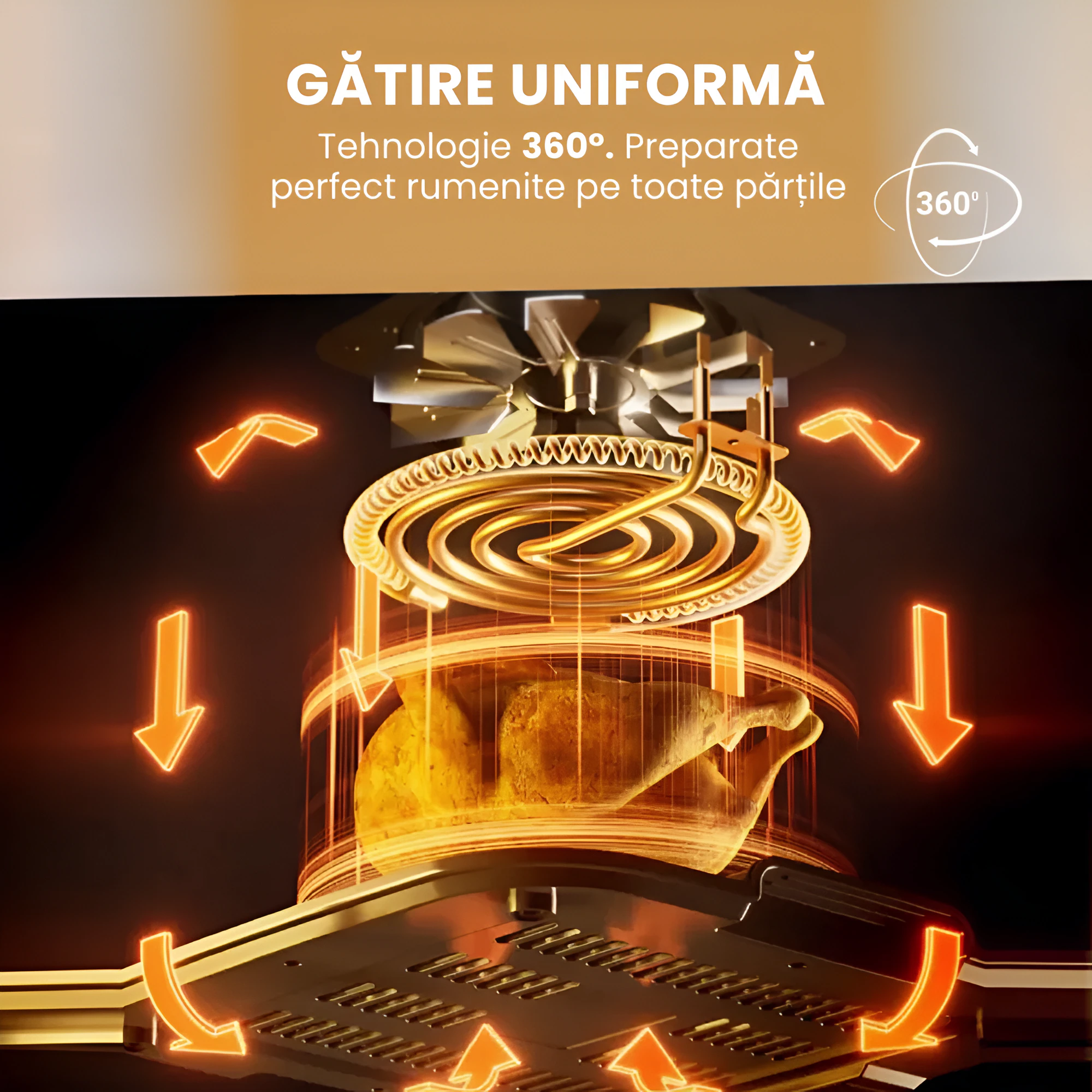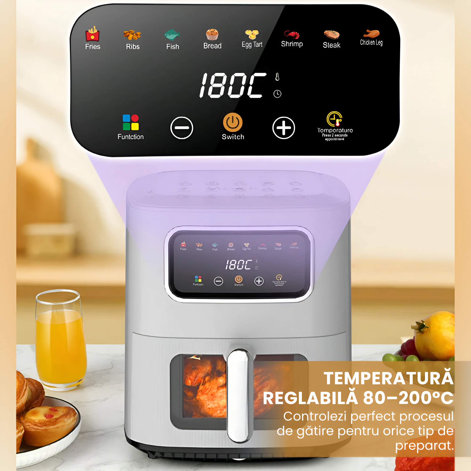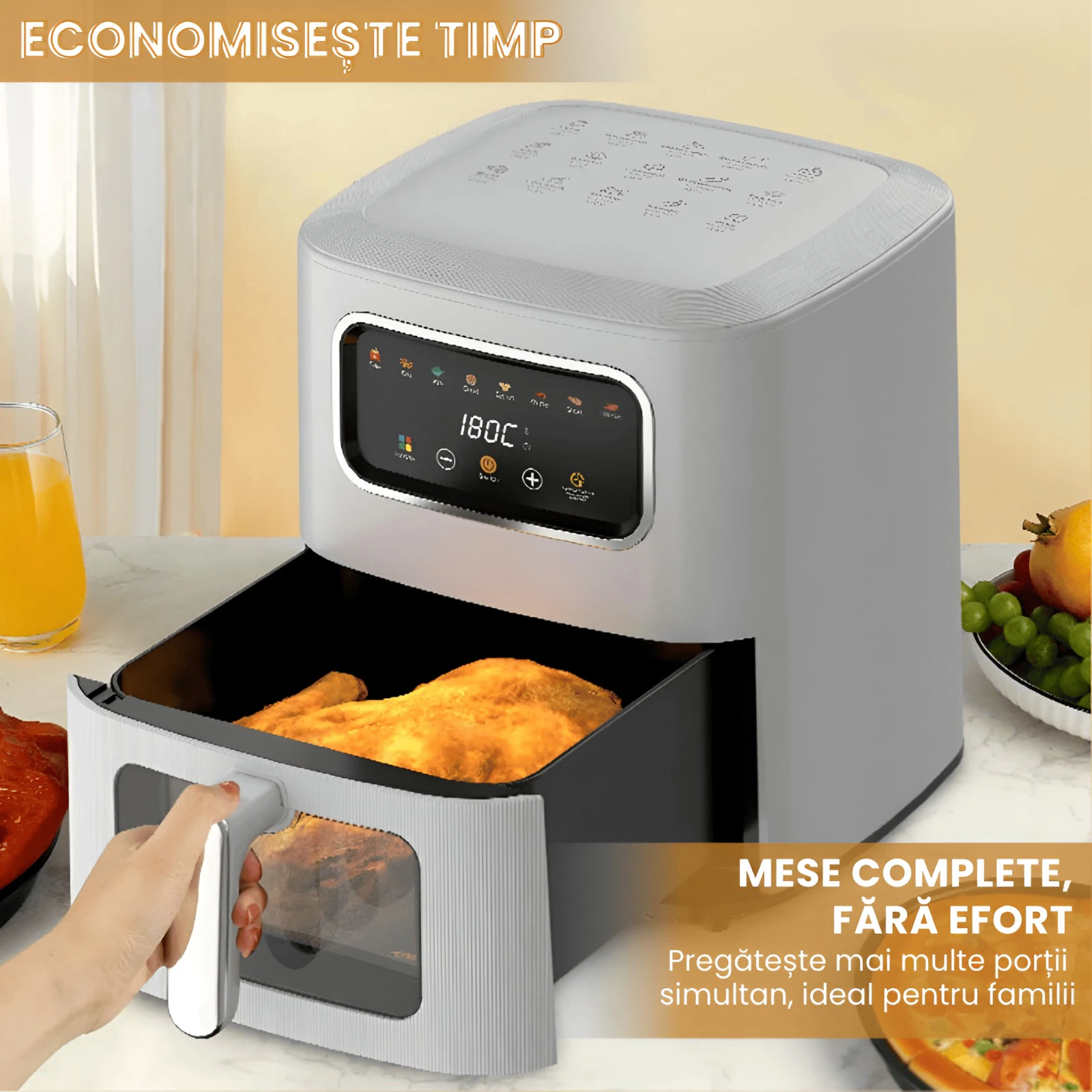Friteuza cu aer cald 8 in 1, cu capacitate de 10 litri, este ideala pentru gatit rapid, sanatos si fara ulei. Tehnologia de circulatie a aerului fierbinte asigura alimente crocante la exterior si fragede la interior, reducand consumul de ulei cu pana la 80%. Inlocuieste cuptorul electric, friteuza clasica, gratarul de interior si cuptorul cu microunde, economisind spatiu in bucatarie.