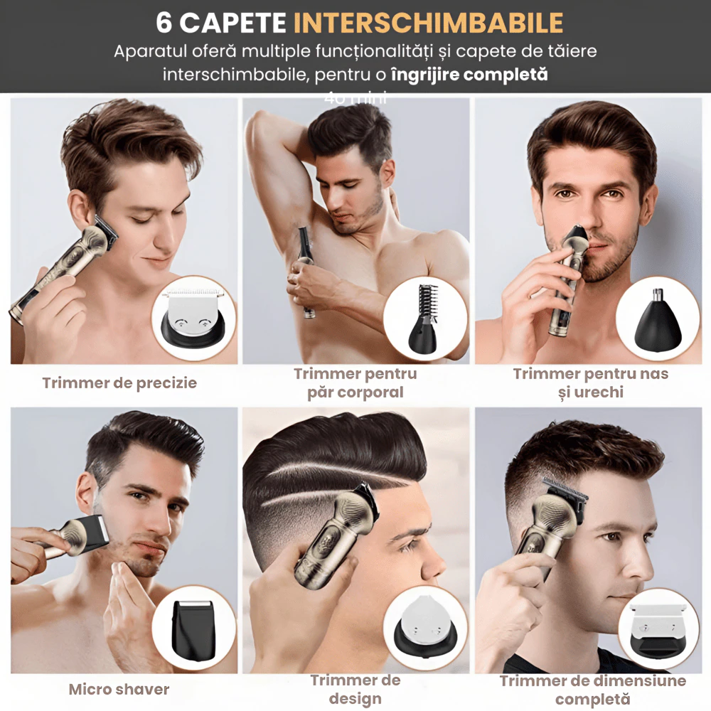 • Capete de taiere interschimbabile: 6 capete pentru diverse functii: ras, tuns par, indepartare par nas, detaliere, barbierit corporal, ajustare lungime