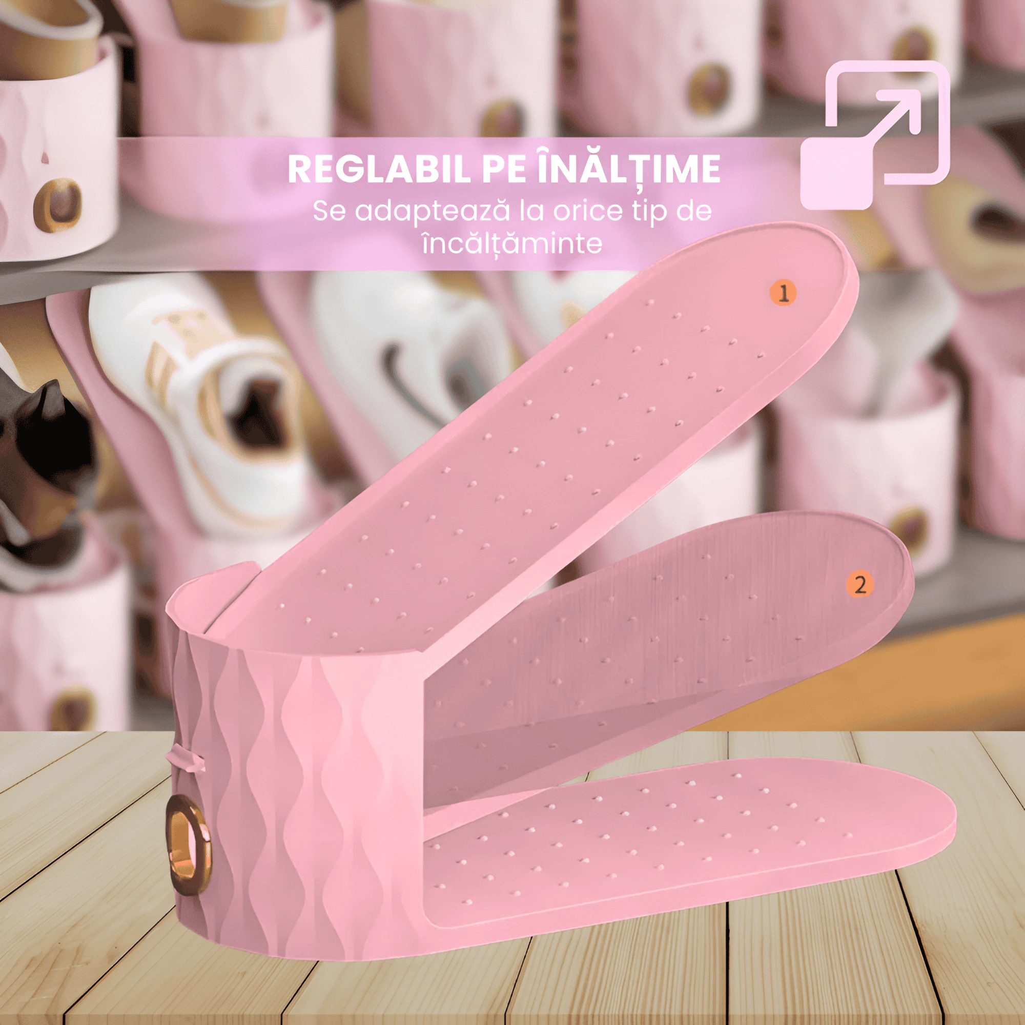 Organizator Incaltaminte Reglabil Pentru Dulap si Rafturi, Suport Vertical, Economisire Spatiu, Compatibil Pantofi, Sport, Sandale, Balerini, Tocuri, Ghetele Usoare, Material Rezistent, Suprafata Anti Alunecare, Roz