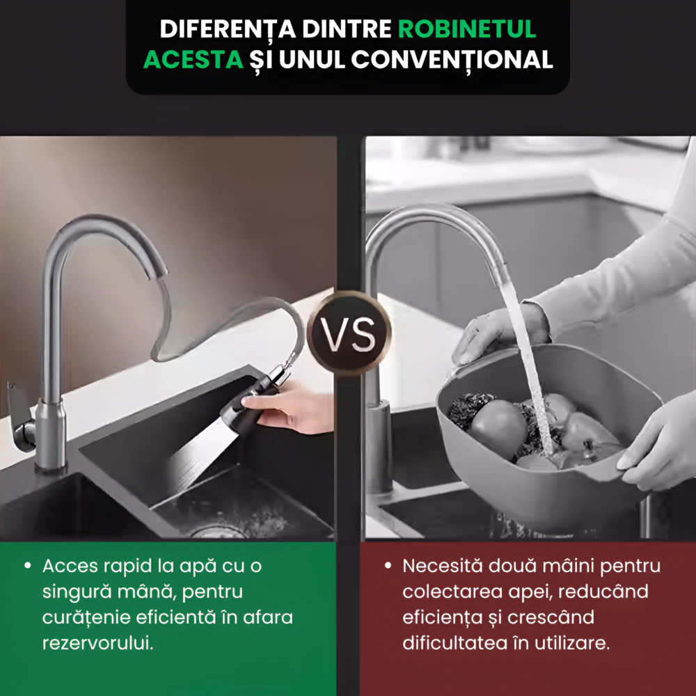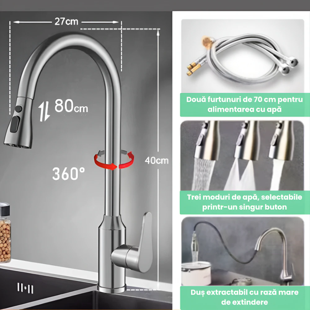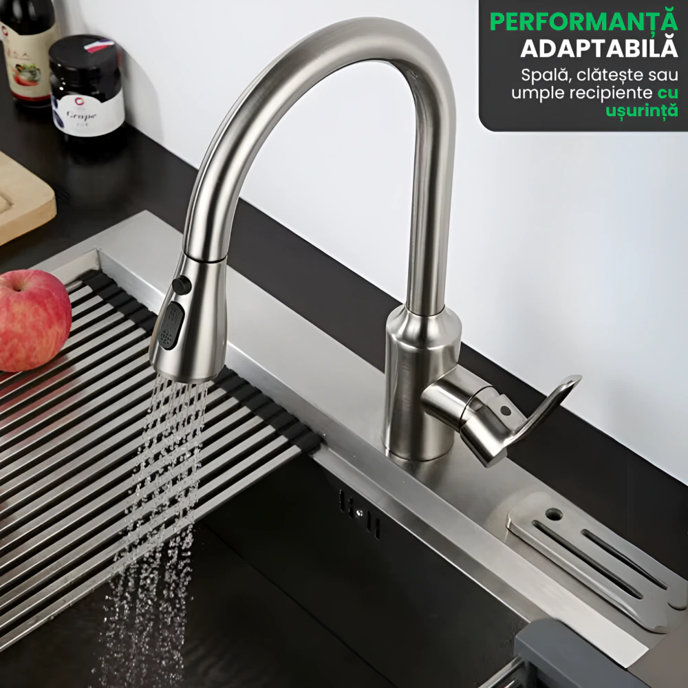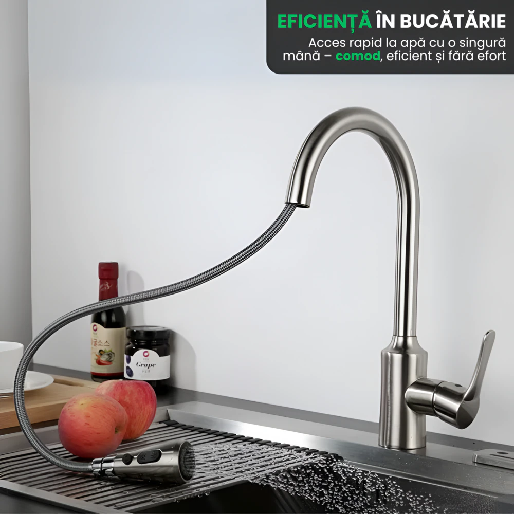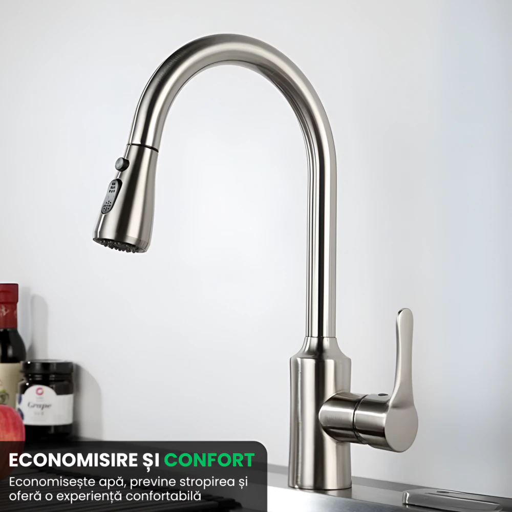 - Tragere Extensibila: Capul retractabil acopera toata chiuveta, ideal pentru spalat vase sau clatire alimente.