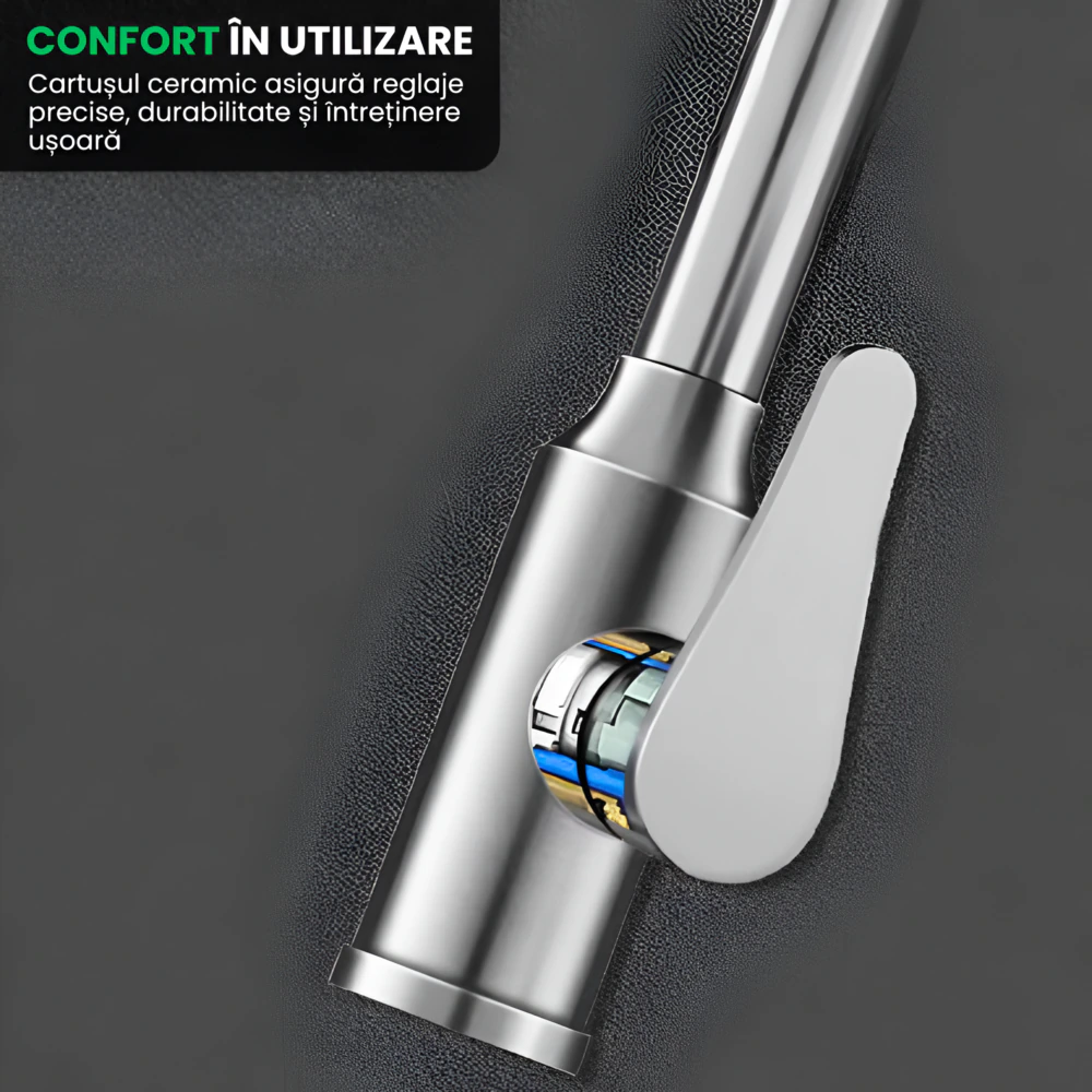 - Control Intuitiv: Mecanism simplu pentru ajustarea rapida a temperaturii si debitului.