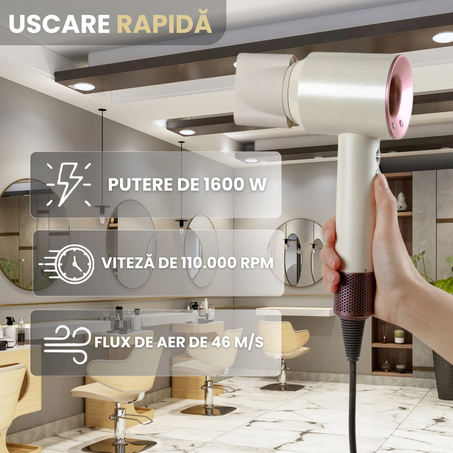 Uscator Par Profesional, Uscare Rapida 1600W, Motor 110000RPM, Protectie Termica, Anti Supraincalzire, Flux Aer 46ms, Putere Coafare Profesionala